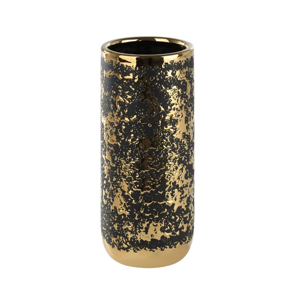 421497 Ваза ARROYITO, ?100, H250, керамика, черный, золотой создает в помещение уют и прекрасно дополняет интерьер квартиры или загородного дома, оформленный как в классическом, так и современном стиле. Продукцию, принадлежащую к дизайнерскому классу, создают только из самых качественных и безопасных материалов с использованием новейших технологий производства. В ней идеально выверена каждая деталь. Изделие преображает пространство, гармонично сочетая в себе уют, удобство и красоту. Этой стильной модели не страшны капризы моды — и через год, два, пять она будет смотреться также уместно.